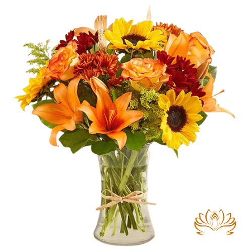 - Accented with wheat, solidago, and assorted greenery