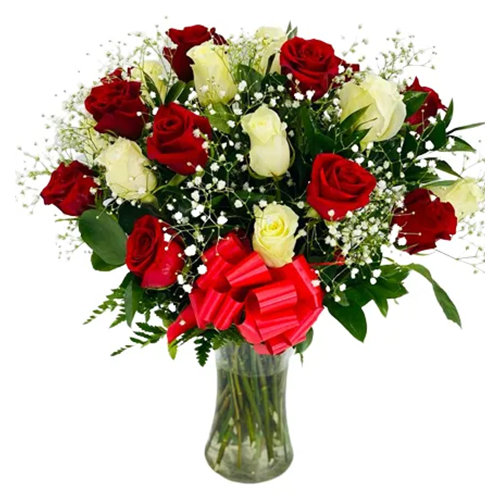 Includes: Roses, Baby Breath, Bow, Vase. (Standard: 1 Dozen-Deluxe: 2 Dozen-Premium 3 Dozen)