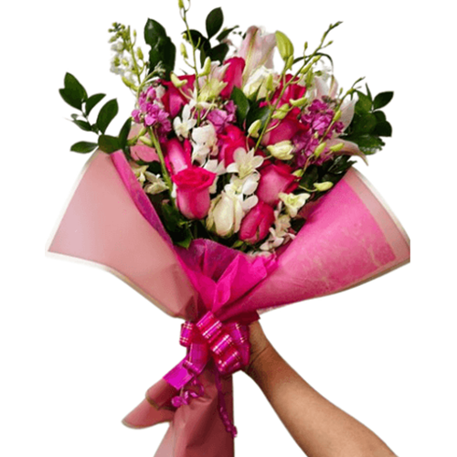 Make your loved ones an amazing day by giving them this gorgeous bouquet with beautiful Assorted flowers with pink color tones, and white and green touches. Fresh and beautiful wrapped in paper with a bow.