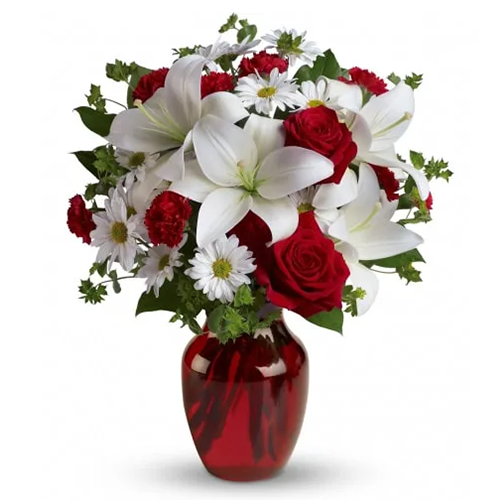 Includes: Roses, Daisies, Spray Roses, Lilies, Greenery, Vase.