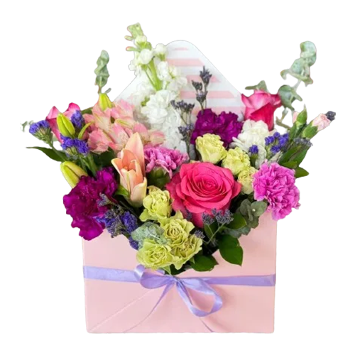 Send a sensational surprise; an envelope shape box with beautiful flowers, perfect to brightest up someone’s day!