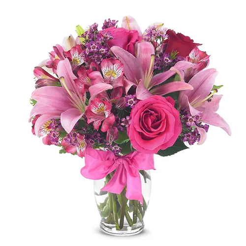 This arrangement includes pink lilies, hot pink roses, red roses, pink alstroemeria, purpleĀ flowers and greenery.