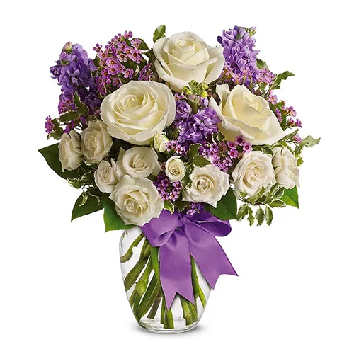 This arrangement comes in a glass vase and includes white roses, white spray roses, purple wax flower, lavender stock and greenery.
