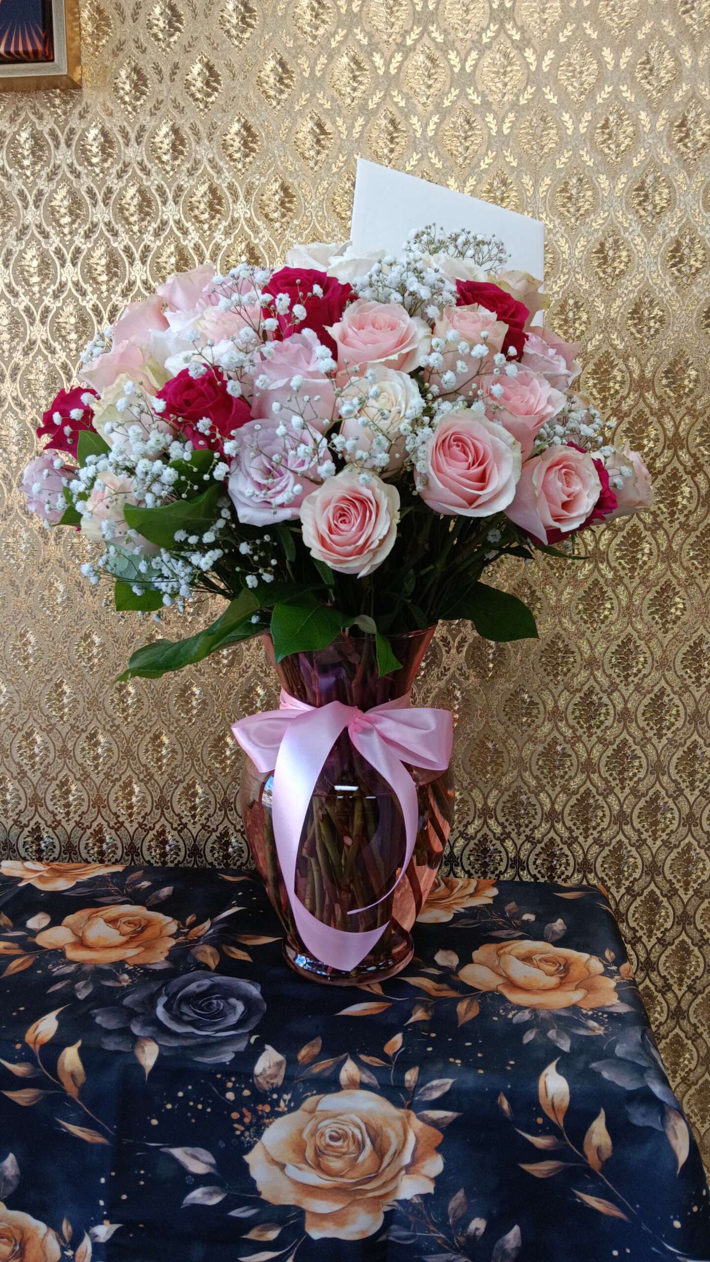 Featuring two dozen light pink/hotpinkroses, baby breath and greeneries, in a pink vase with a pink ribbon.