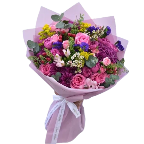 This bouquet includes lavender roses, assorted purple flowers, pink alstroemerias, pink spray roses, white assorted flowers, solidago and greenery. Flowers are wrapped in paper, with a matching bow.