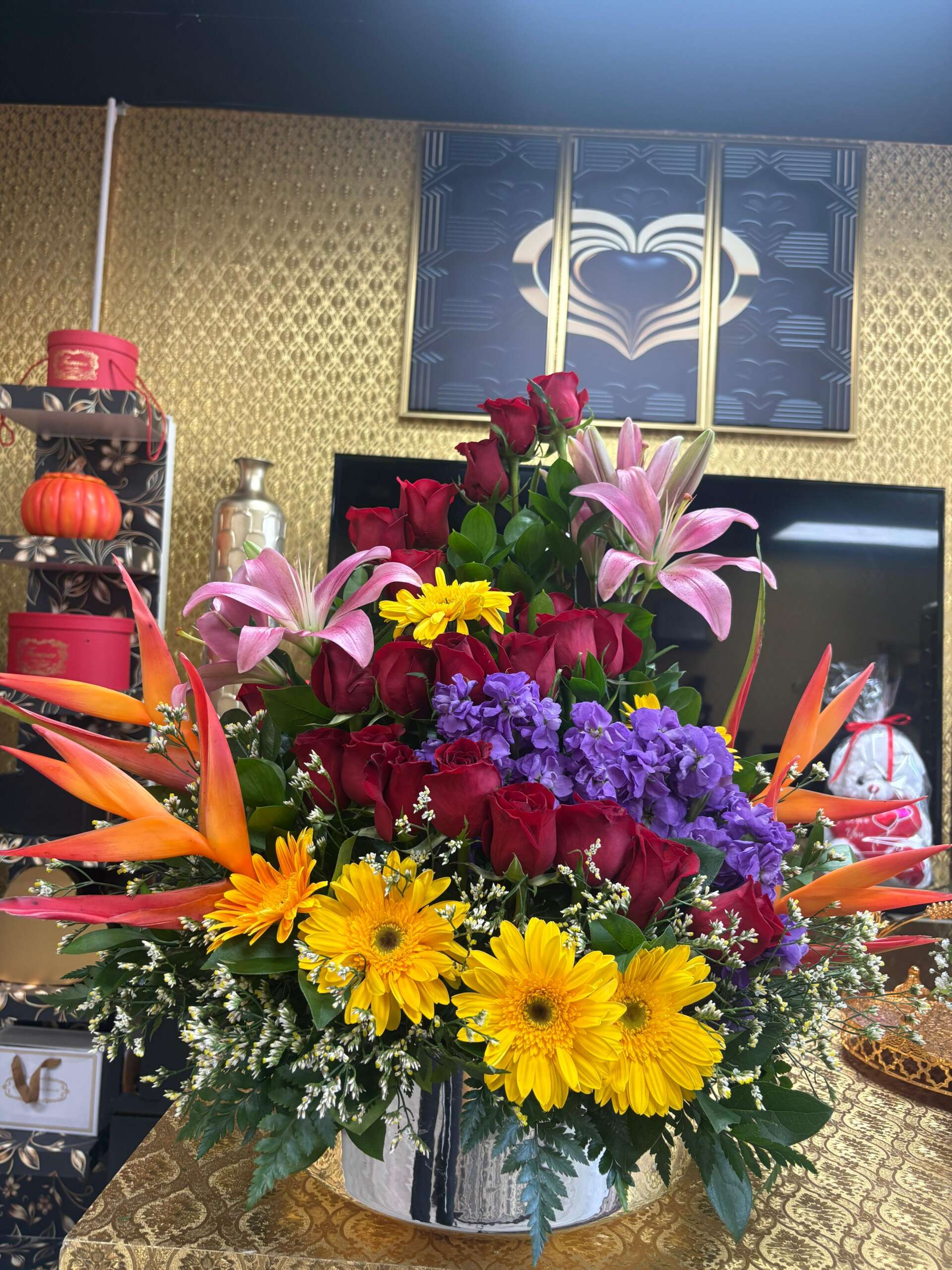 ELLIE FLOWERS AND COFFEE SHOP exclusive arrangement, featuring 50 Large red roses, pink lilies, heliconias, yellow gerberas, assorted purple flowers, baby breath and greeneries, in a large vase.